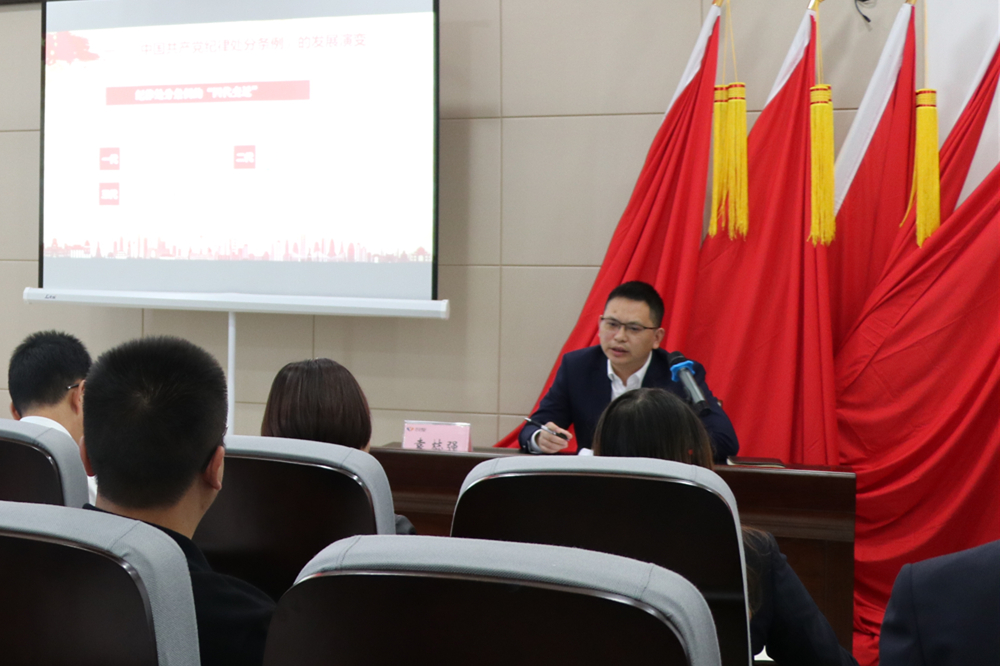 10月17日,瀘州城投集團副總經(jīng)理袁梽強以“學(xué)黨規(guī)黨紀,做合格黨員,以鐵的紀律推動全面從嚴治黨向縱深發(fā)展”為題,為建科公司全體職工講黨課。