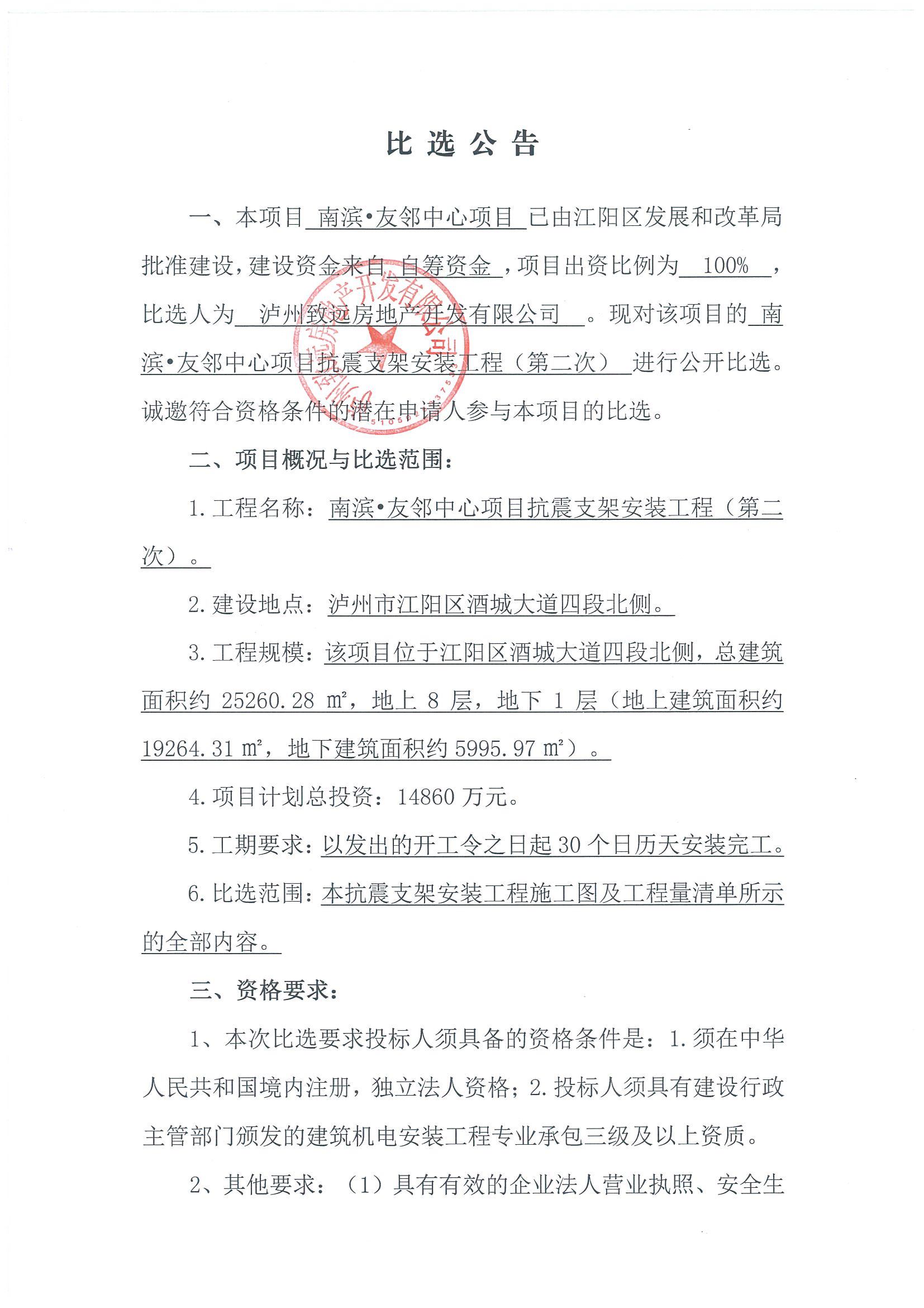 南濱友鄰中心項目抗震支架比選公告(第二次)
