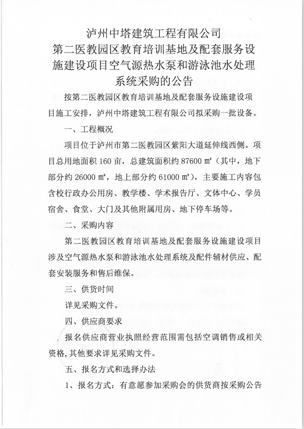 第二醫(yī)教園區(qū)教育培訓基地及配套服務設施建設項目空氣源熱水泵和游泳池水處理系統(tǒng)采購的公告