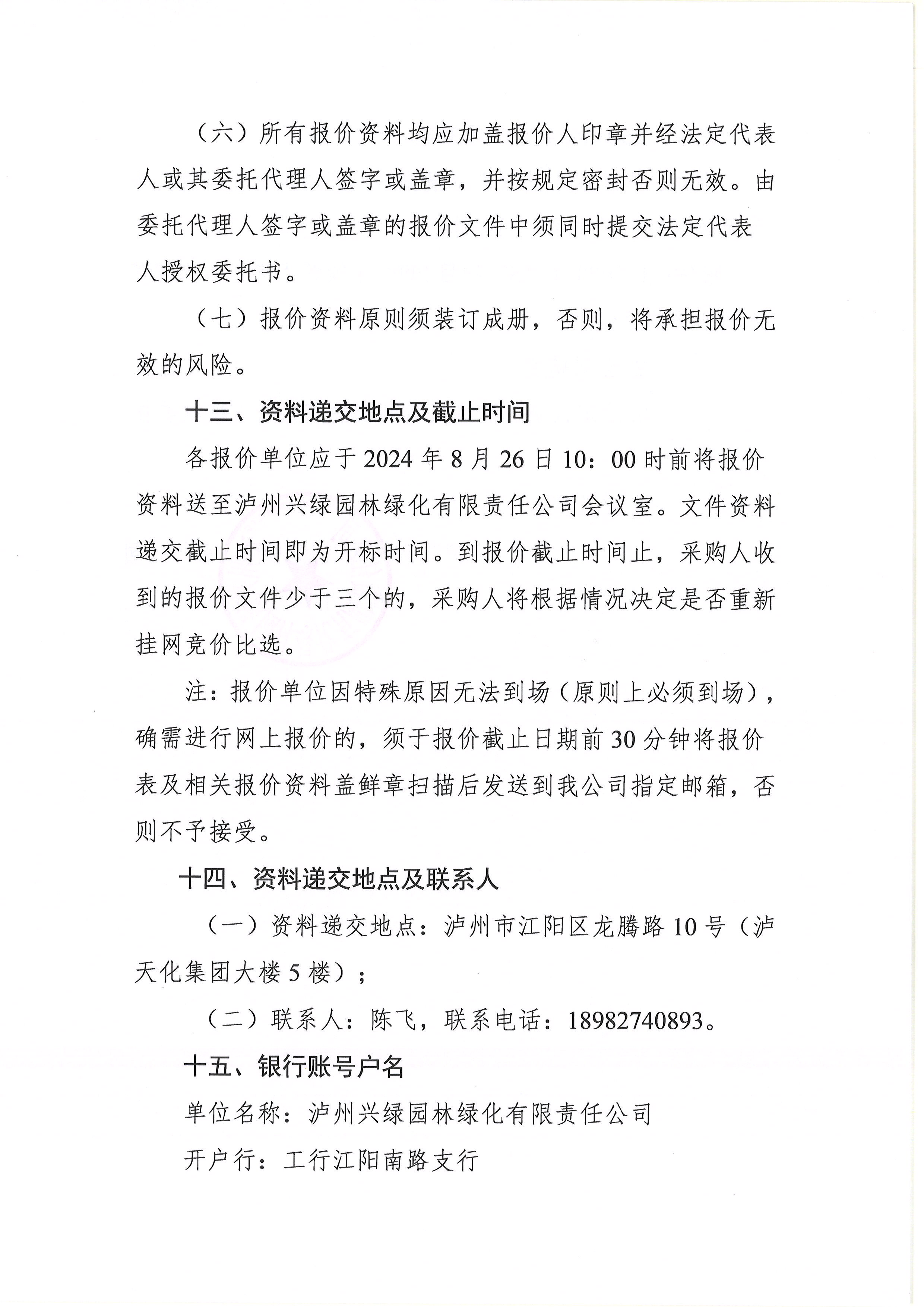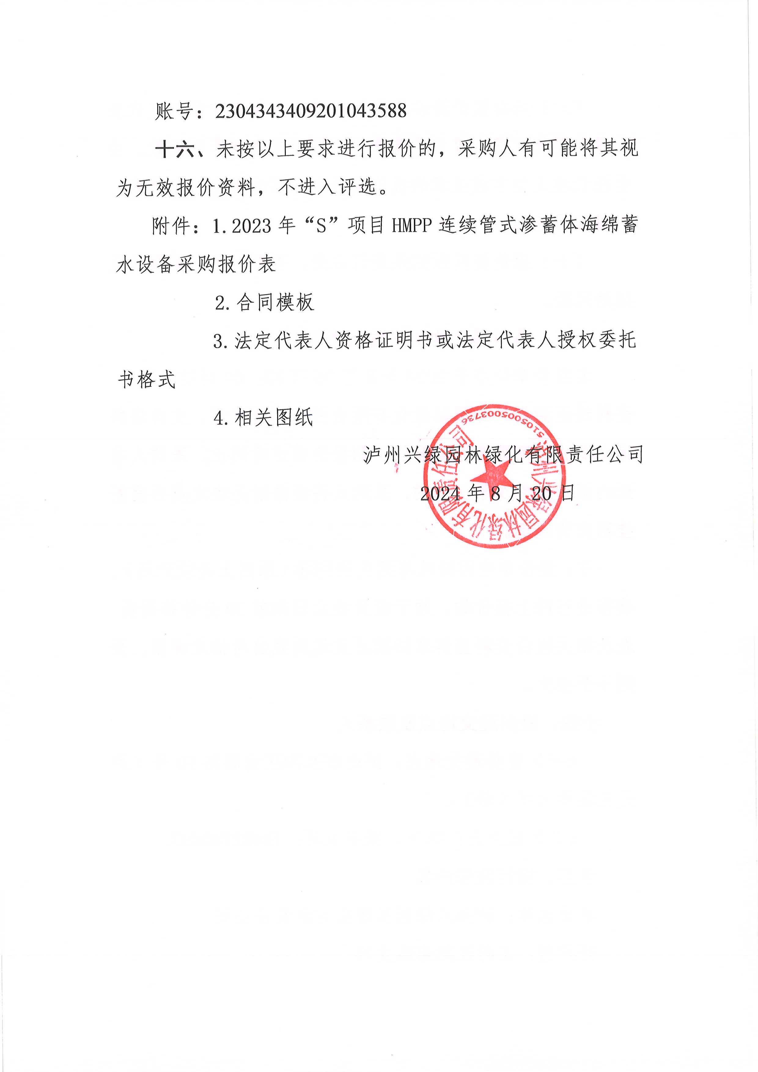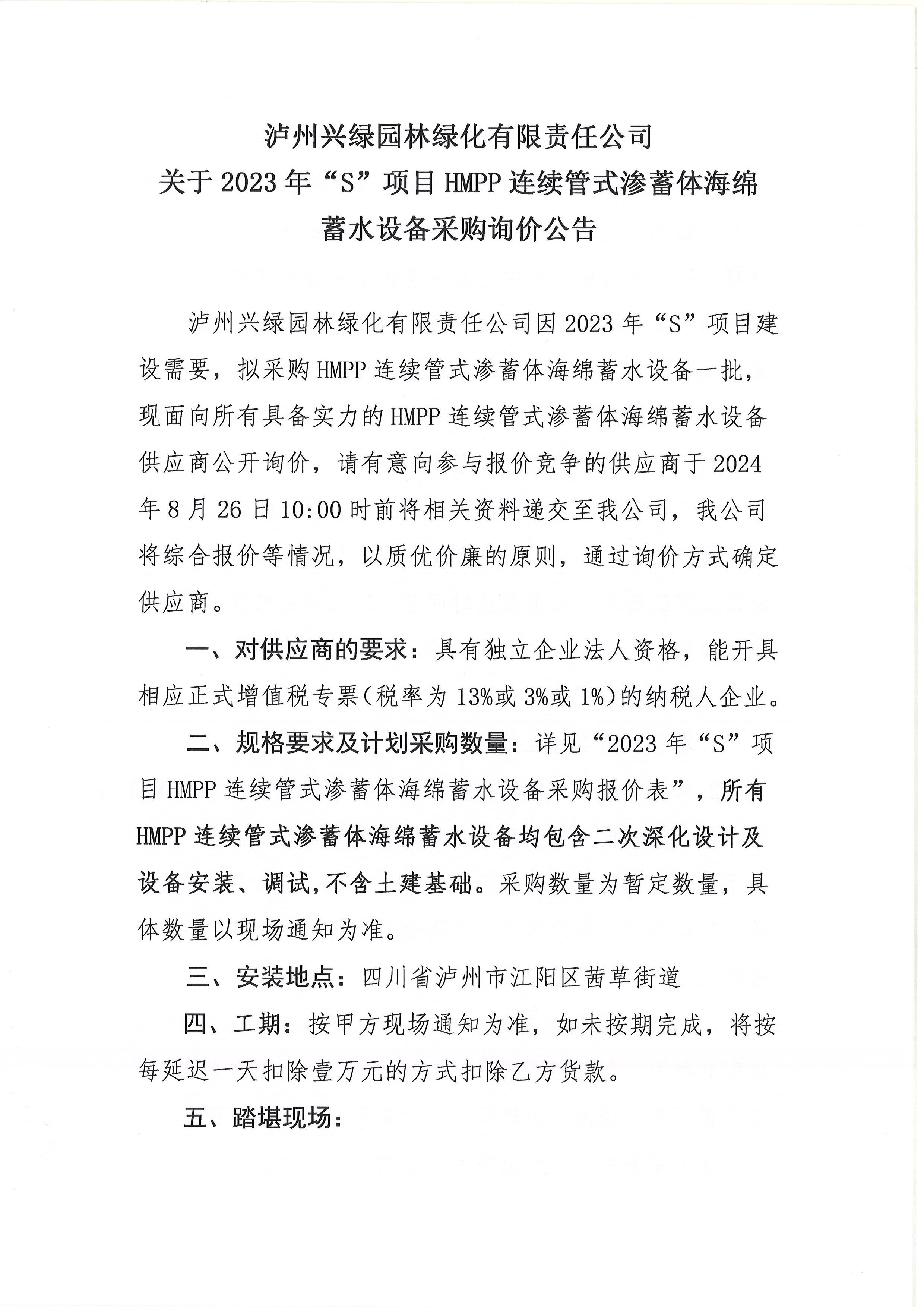 瀘州興綠園林綠化有限責(zé)任公司關(guān)于2023年“S”項(xiàng)目HMPP連續(xù)管式滲蓄體海綿蓄水設(shè)備采購(gòu)詢(xún)價(jià)公告