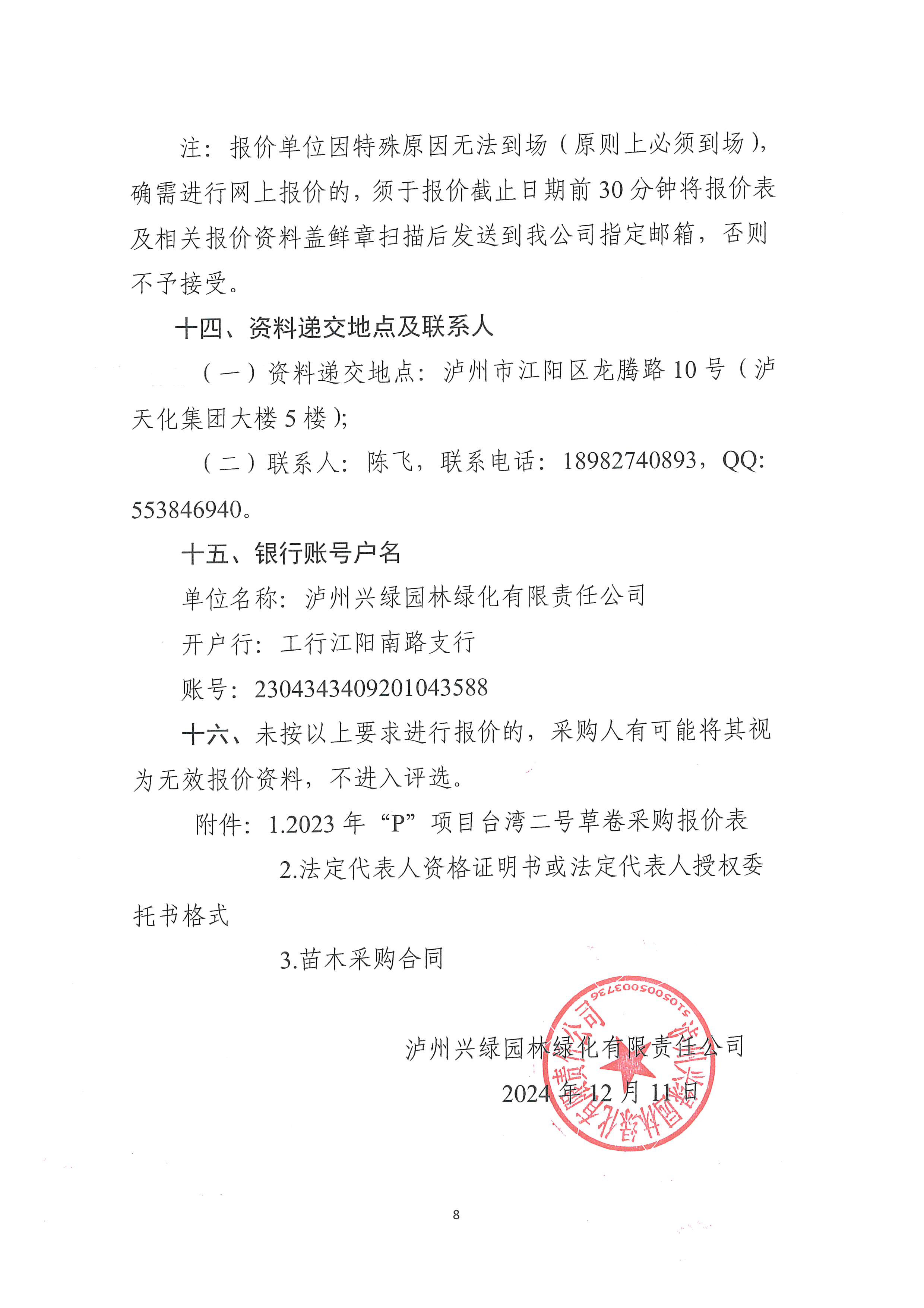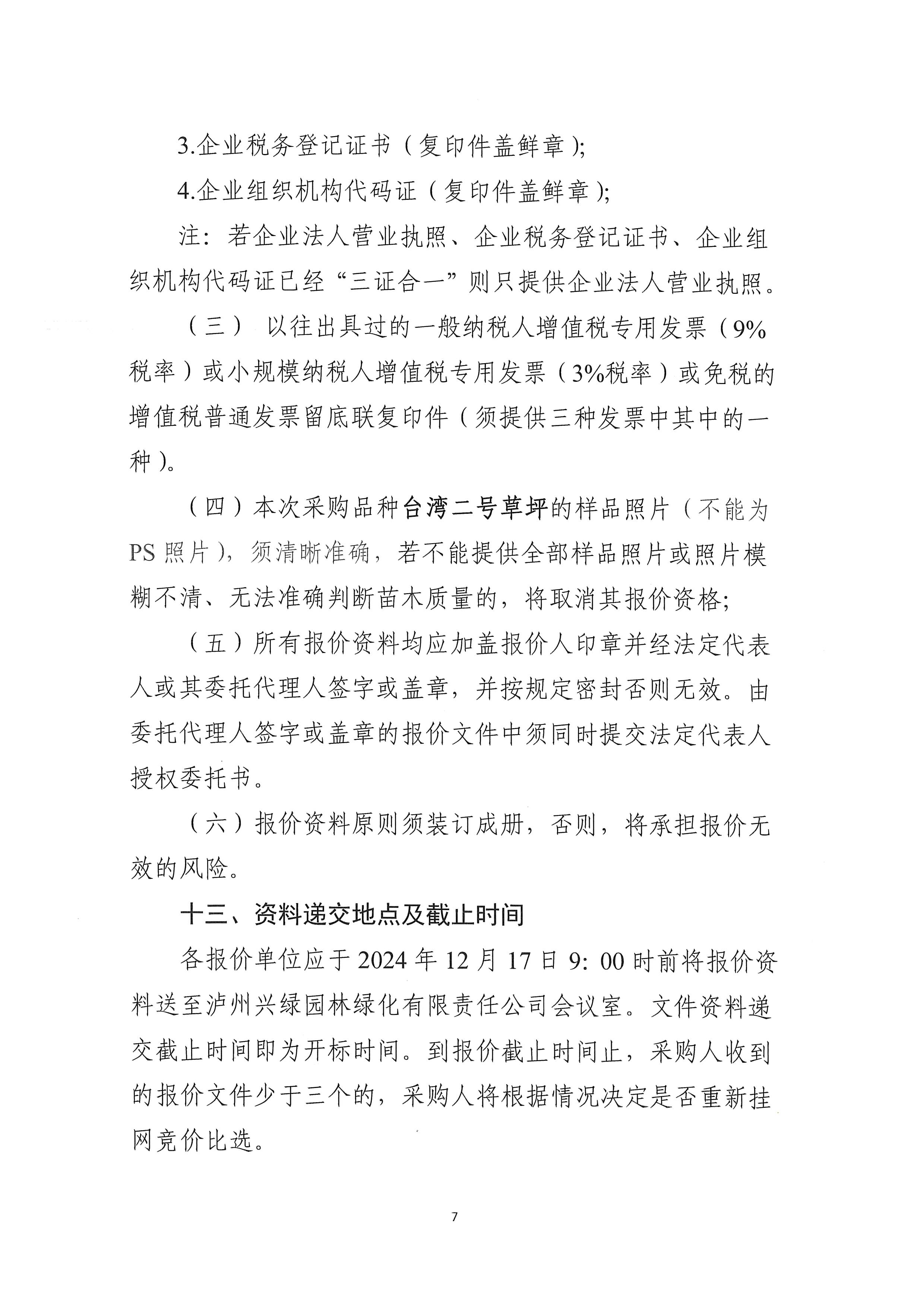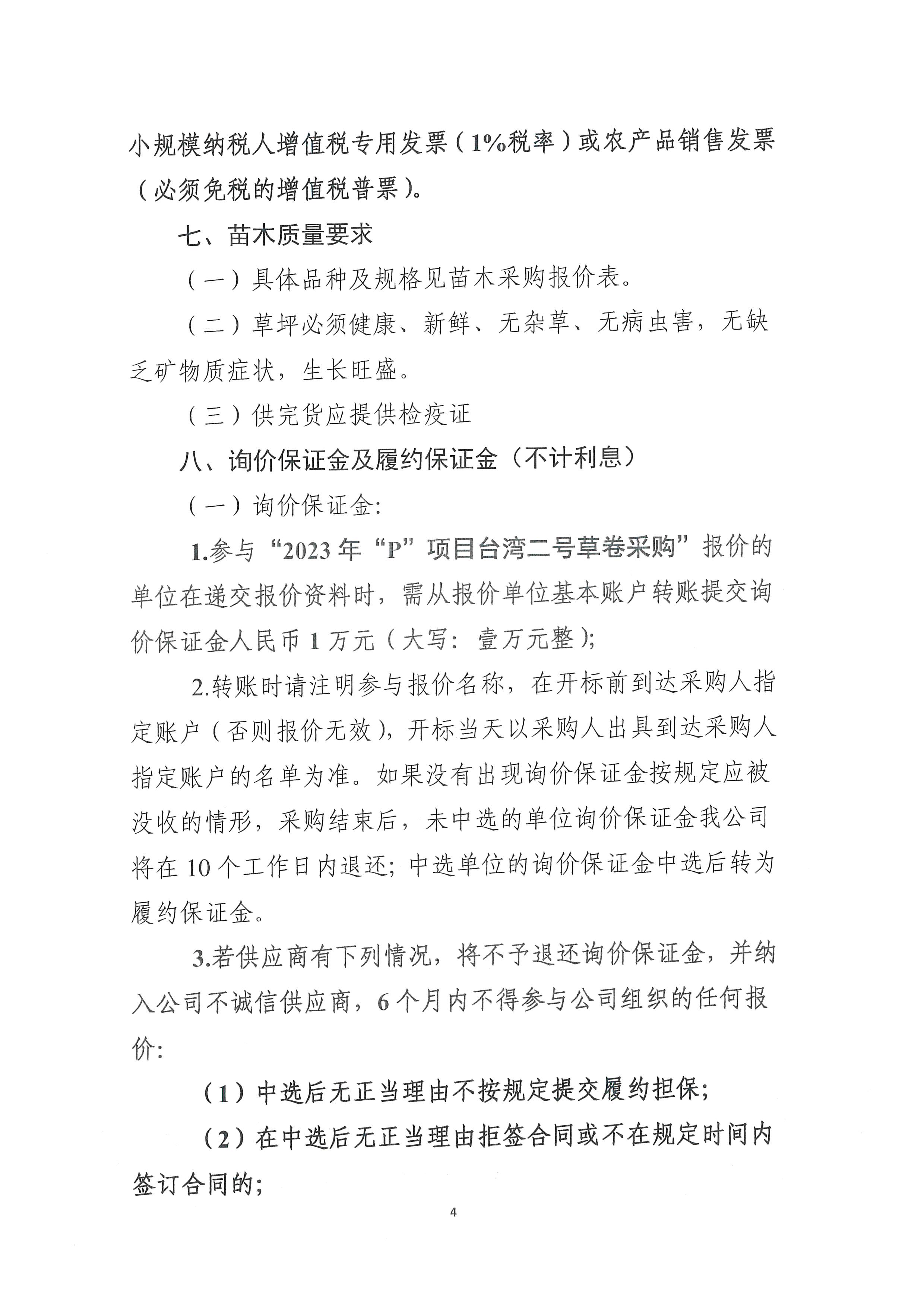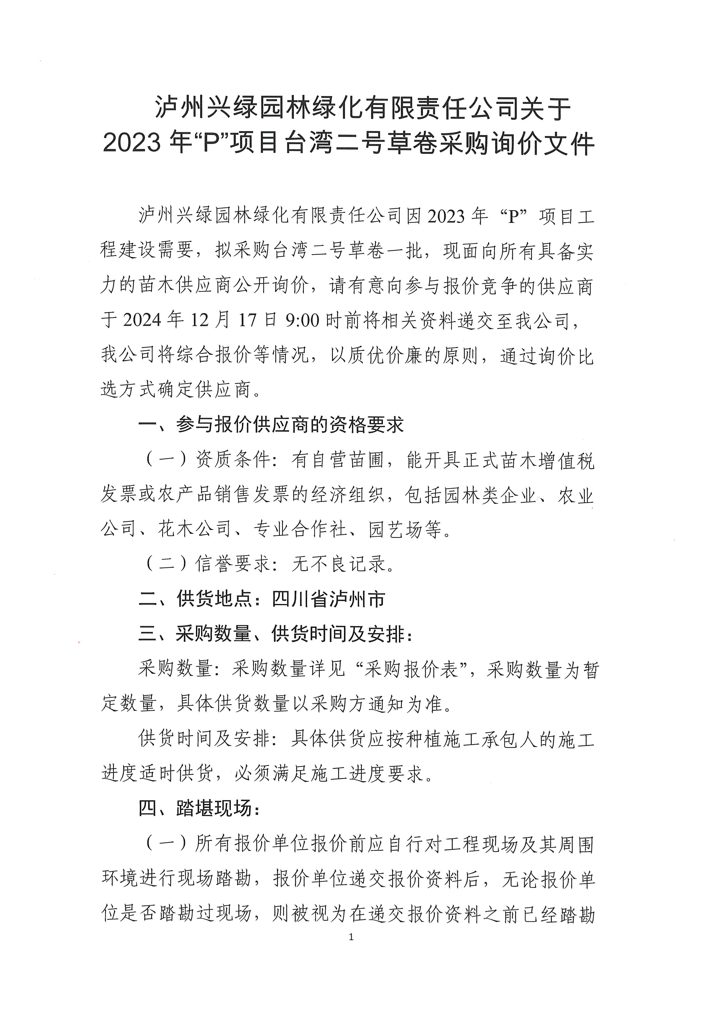 瀘州興綠園林綠化有限責任公司關(guān)于2023年“P”項目臺灣二號草卷采購詢價文件