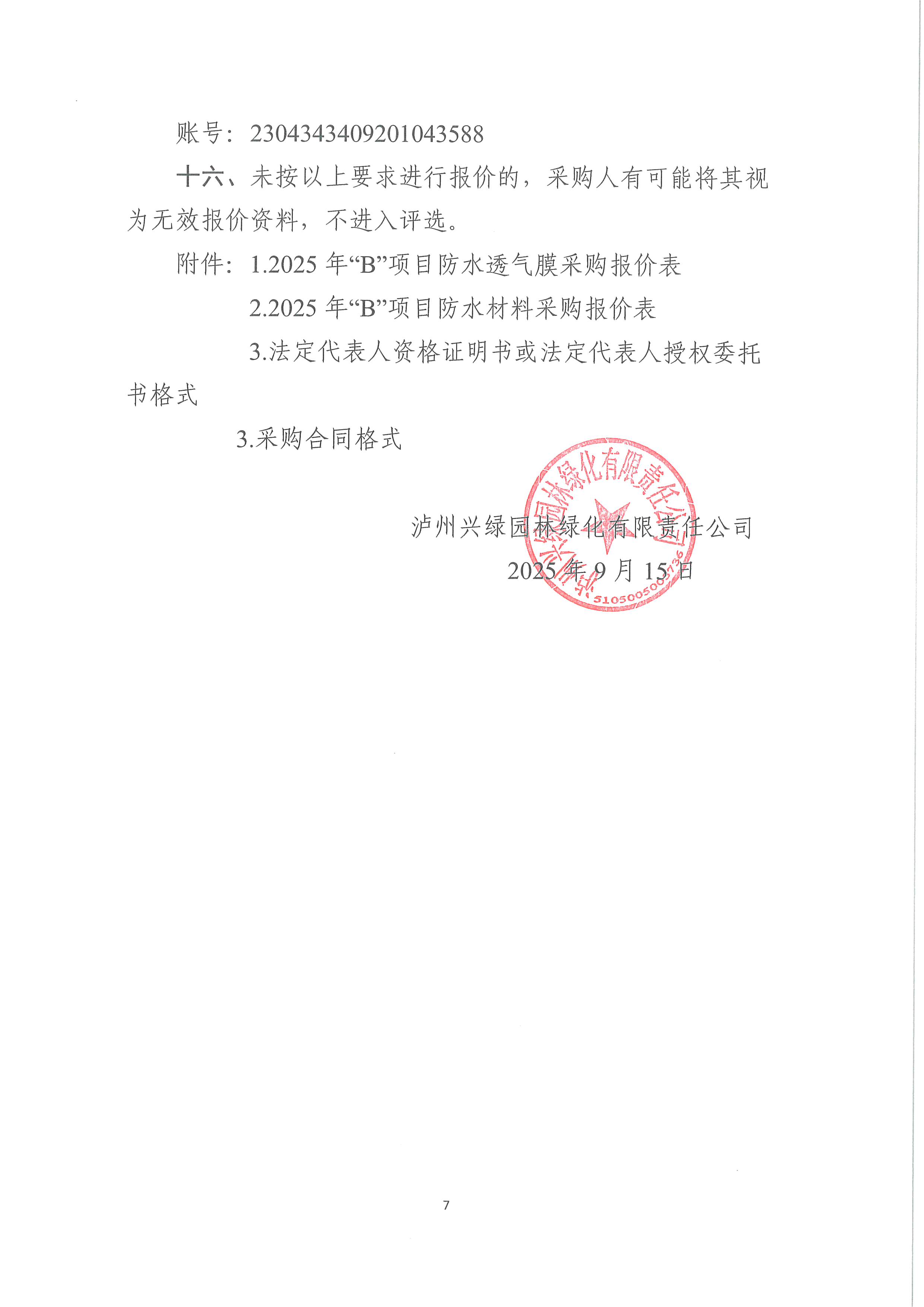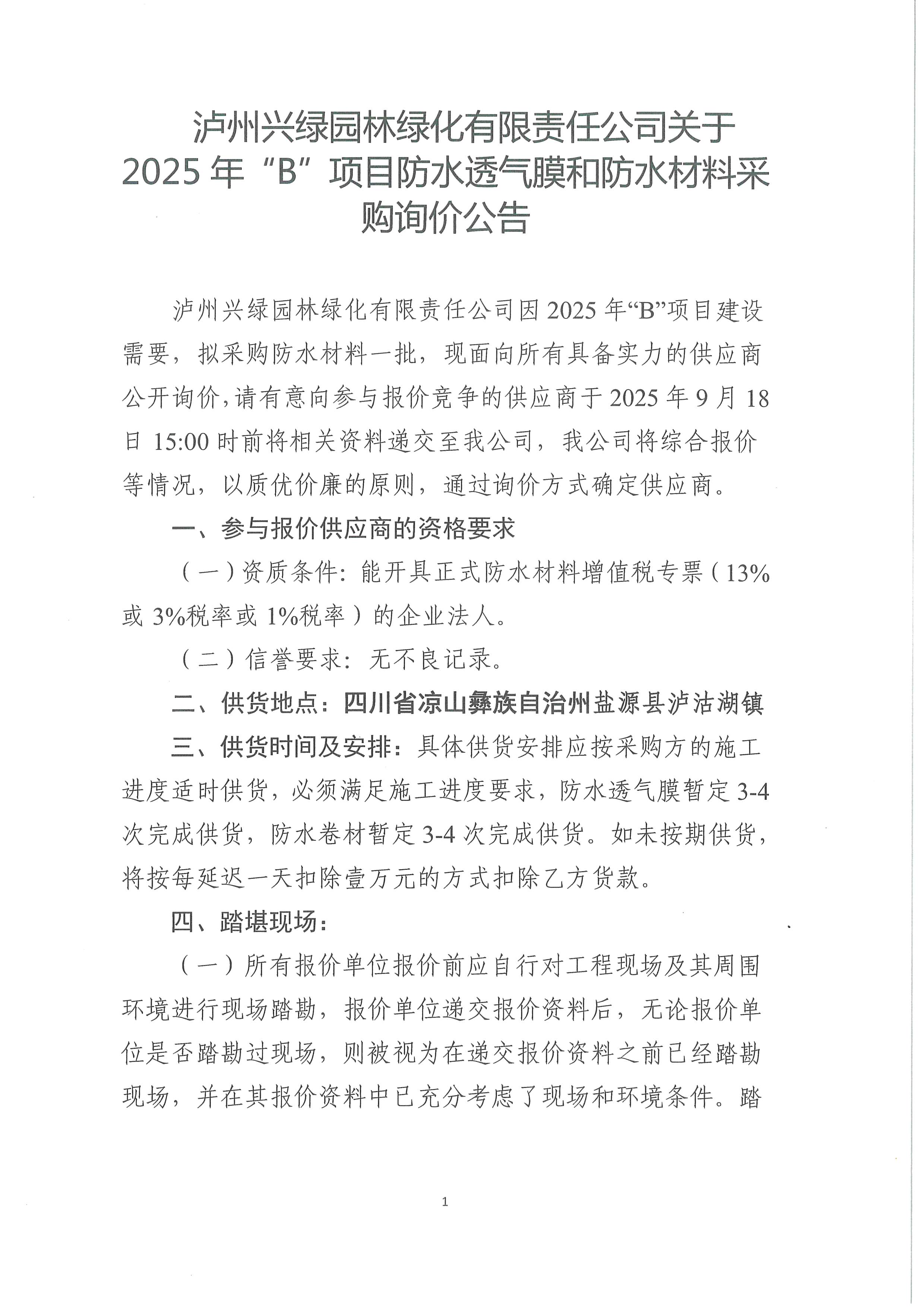 瀘州興綠園林綠化有限責任公司關(guān)于 2025年“B”項目防水透氣膜和防水材料采購詢價公告