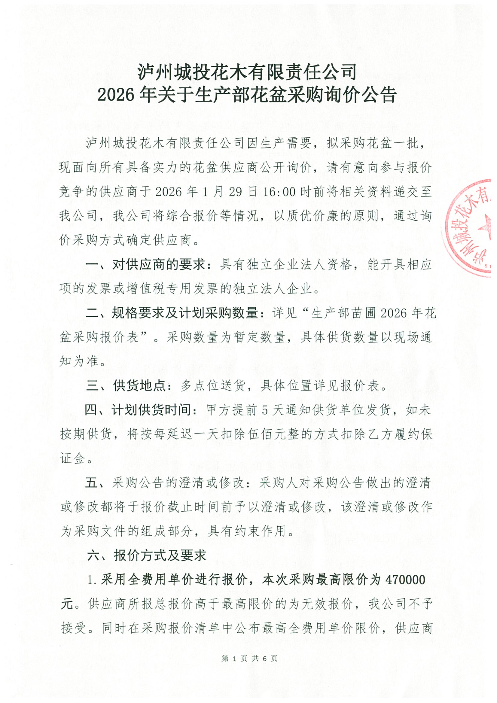 瀘州城投花木有限責(zé)任公司2026年關(guān)于生產(chǎn)部花盆采購(gòu)詢價(jià)公告