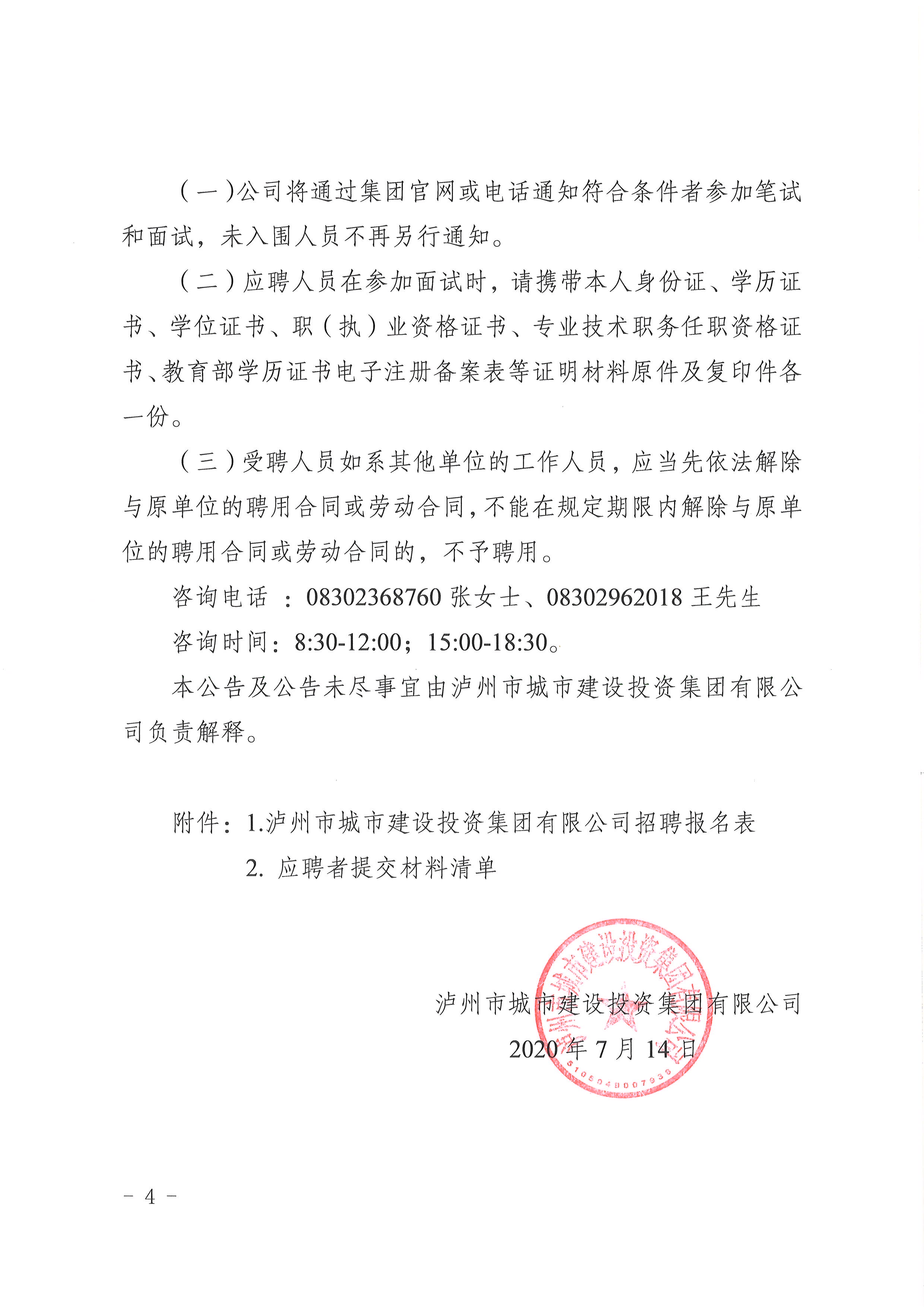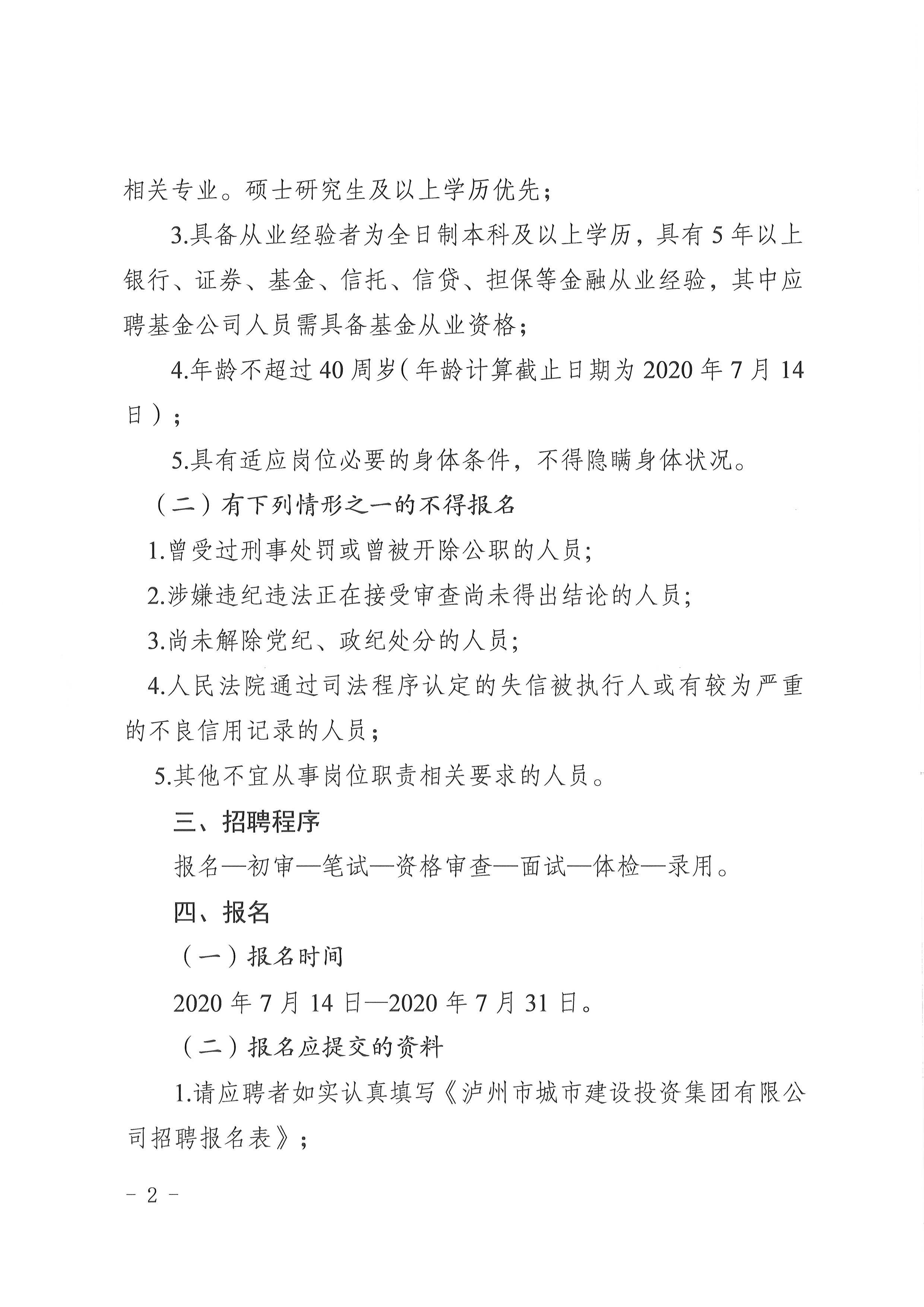 瀘州城投集團2020年社會招聘公告