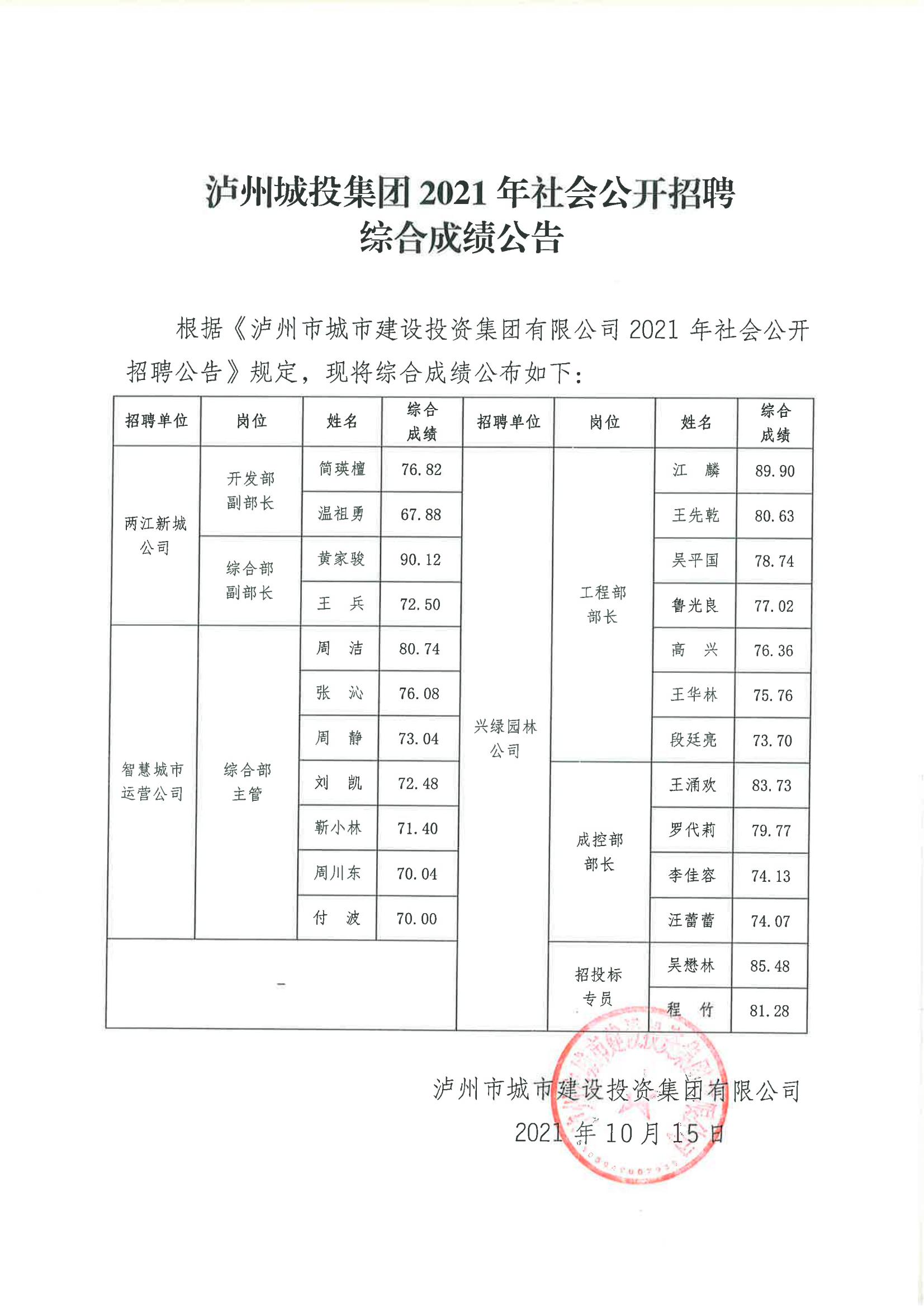 瀘州城投集團(tuán)2021年社會(huì)公開(kāi)招聘綜合成績(jī)公告